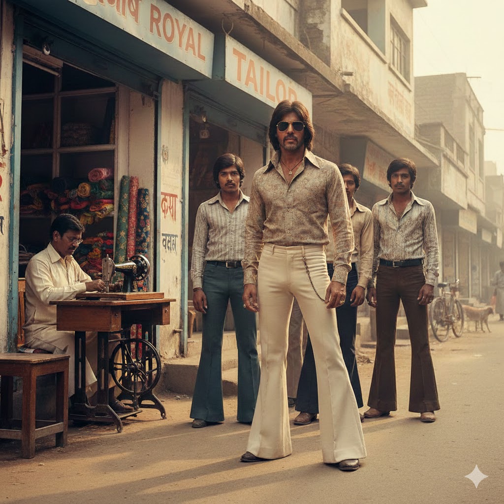 हमारी जवानी उस मोड़ पर आ खड़ी हुई थी, जहाँ एक दौर विदा ले रहा था और दूसरा पूरे आत्मविश्वास के साथ सामने आ रहा था. फिल्मी परदे पर राजेश खन्ना की चमक धीमी पड़ चुकी थी और अमिताभ बच्चन का उभार कस्बों तक अपनी आहट पहुँचा चुका था. वही बदलाव कपड़ों में भी दिखाई देने लगा था. बेलबॉटम पैंटें, चौड़ी मोरियाँ और चेहरे पर उगता हुआ नया एटीट्यूड.