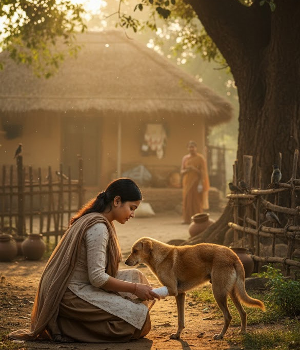 कभी अपनी पुरानी ओढ़नी फाड़कर पट्टी बाँध देती। उसके स्पर्श में अजीब-सी शांति होती. जैसे दर्द को कोई नाम मिल गया हो।जानवर उसके पास आकर चुप हो जाते, मानो कह रहे हों-“तू समझती है…”