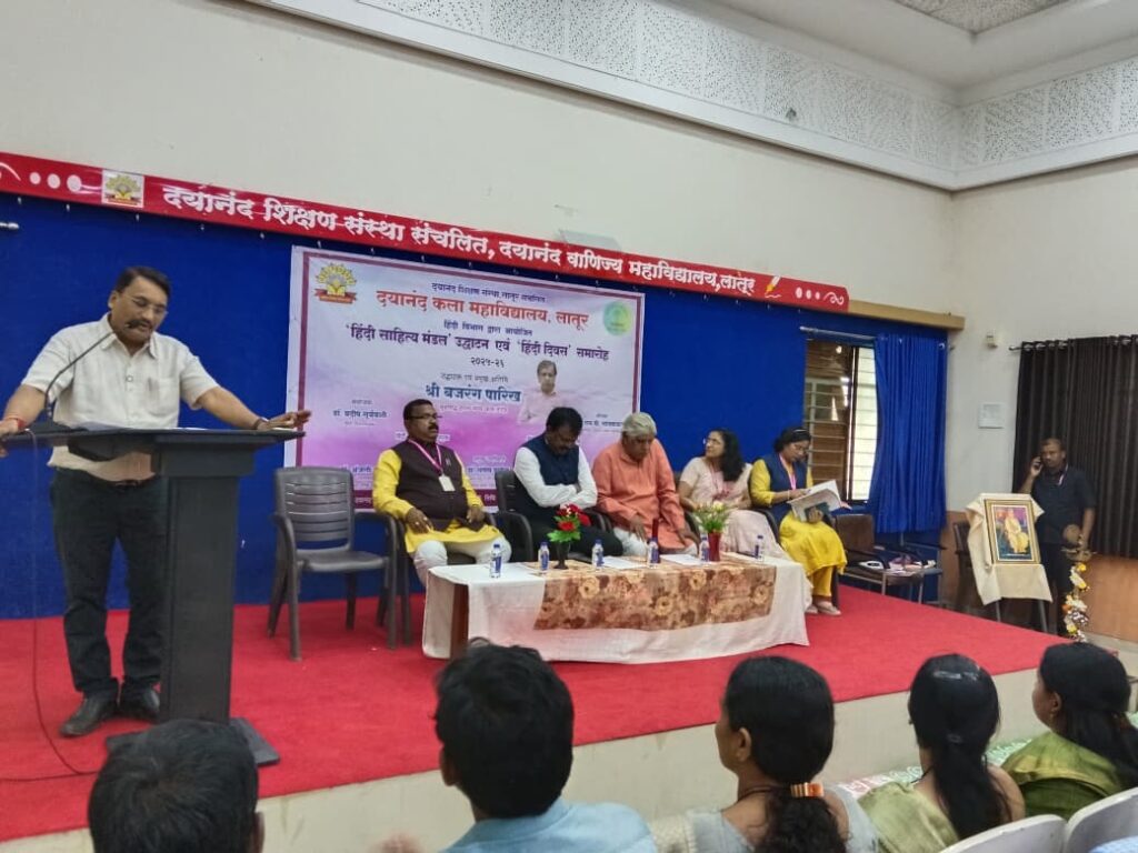 दयानंद कला महाविद्यालय, लातूर में “हिंदी दिवस” बड़े उत्साह और गरिमा के साथ संपन्न हुआ। यह कार्यक्रम हिंदी भाषा के महत्त्व, इसके विकास और वर्तमान समाज में इसकी प्रासंगिकता पर आधारित था। कार्यक्रम का आयोजन हिंदी विभाग द्वारा किया गया।