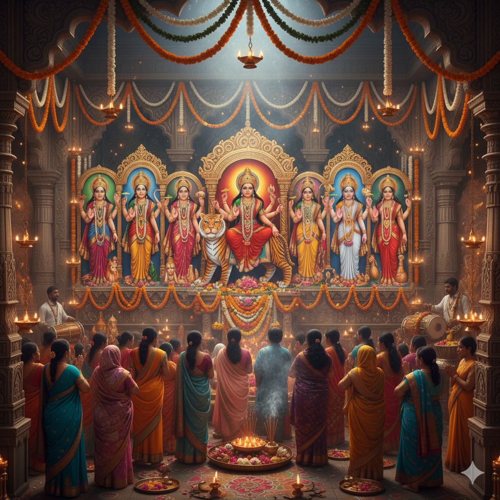 लाल वस्त्र सिंह-वाहिनी, माँ दुर्गे का रूप।
