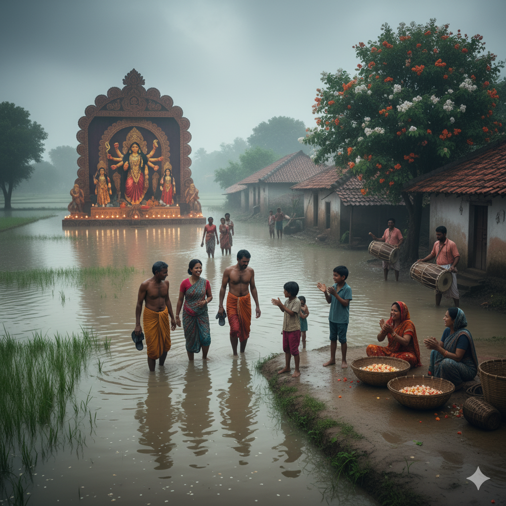 गाँव के एक स्थान से दूसरे को जोड़ने वाली पगडंडी पूर्णतः डूबी हुई रहती थी। उसे पार करने वाले के एक हाथ में चरणपादुका, दूसरे से घुटनों तक कपड़ा उठाए… बड़ी एहतियात से फूँक-फूँक कर पार करते। ज़रा भी चूके कि छपाक से गड्ढे में गिर जाते—सत्यानाश! बच्चों का क्या, वे तो ताली बजाने और खिलखिलाने में मस्त रहते।