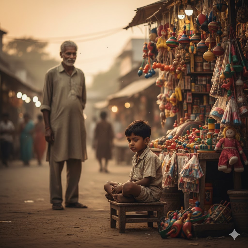 मेले में बाबूजी के एक परिचितशायद शामगढ़ के राधास्वामी जनरल स्टोर्स से जुड़े हर साल खिलौनों की दुकान लगाते थे. उन्हें एक हेल्पर चाहिए था. बाबूजी ने बात की और मेरा दुकान पर बैठना तय हो गया. सुबह दस से शाम छह. मेहनताना तय नहीं था. बाबूजी का उद्देश्य था. बिजनेस समझाना. और मेरा लालच था. दिन भर मेले में रहना, खिलौनों के बीच. सेठ जी भले आदमी थे. दिन में दो-तीन बार चाय, कभी नाश्ता और मैं खुश. पहला दिन अच्छा गुज़रा. शाम को चार रुपए मिले. मुझे लगा, मैं भी कुछ कर सकता हूँ.