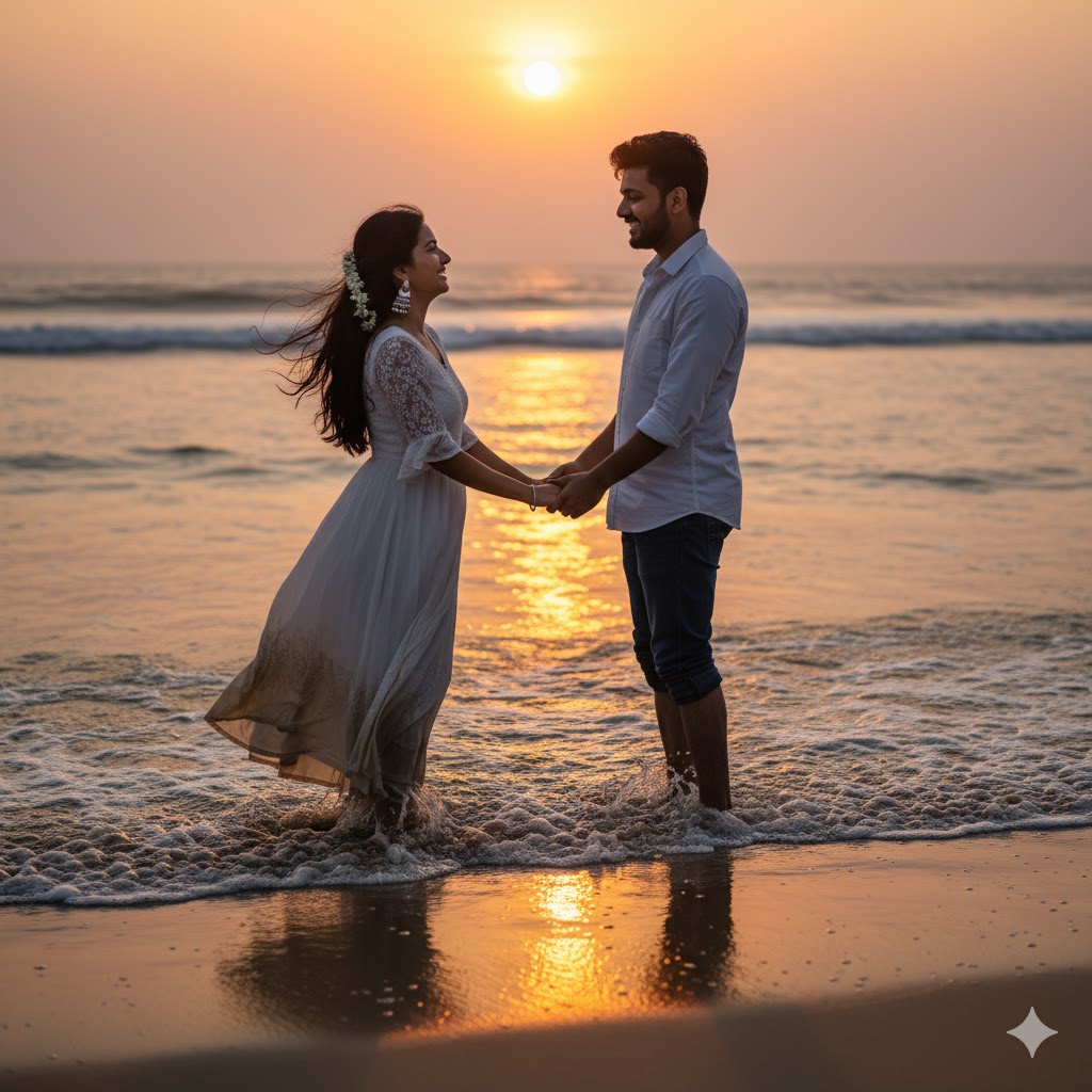 गोधूलि बेला में समंदर का रेतीला तट सुनहली रश्मि किरणों से मायावी हो उठा है।