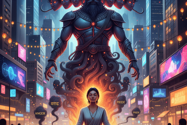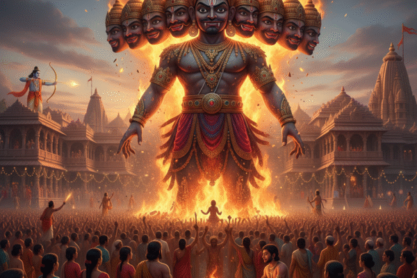यह लेख रावण दहन की पौराणिक कथा को जीवंत और संवादात्मक अंदाज़ में प्रस्तुत करता है। इसमें बताया गया है कि रावण केवल एक राक्षस नहीं बल्कि विद्वान और शिवभक्त था, पर अहंकार और लालच के कारण उसका संहार निश्चित था। लंका युद्ध के समय देवी दुर्गा की पूजा और हनुमानजी की चतुरता से रावण का यज्ञ विफल हुआ और उसका संहार सुनिश्चित हुआ। इस कथा के माध्यम से विजया दशमी केवल पुतला जलाने का उत्सव नहीं, बल्कि बुराई पर अच्छाई की विजय का प्रतीक बन जाती है।