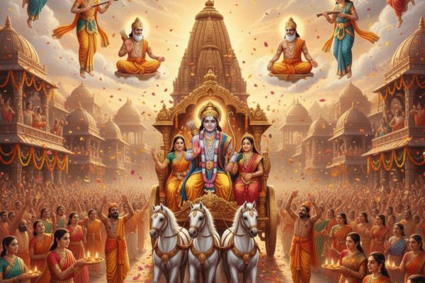 दशहरा का पर्व असुरों के विनाश और धर्म की विजय का प्रतीक है। जब रावण का अंत हुआ, तब देवता भयमुक्त होकर उल्लास से दुंदुभियाँ बजाने लगे और अप्सराएँ गान करने लगीं। ऋषि-मुनि अपने जप और ध्यान में और अधिक एकाग्र होकर उन्मुक्त हो उठे। विभीषण को लंका का राज्य देकर भगवान राम अपने वनवास का अंत कर अयोध्या लौटे। नगरवासियों ने विजयध्वजा फहराई, माता सीता की आरती उतारी और पुष्पों की बौछार की। उस बेला में मिलन और उल्लास का ऐसा वातावरण बना कि नर-नारी आनंद में झूमकर नृत्य करने लगे।
