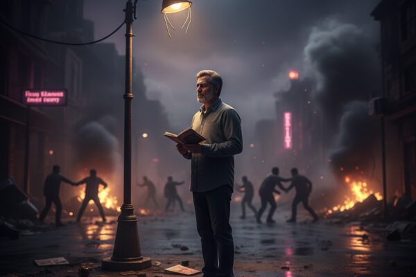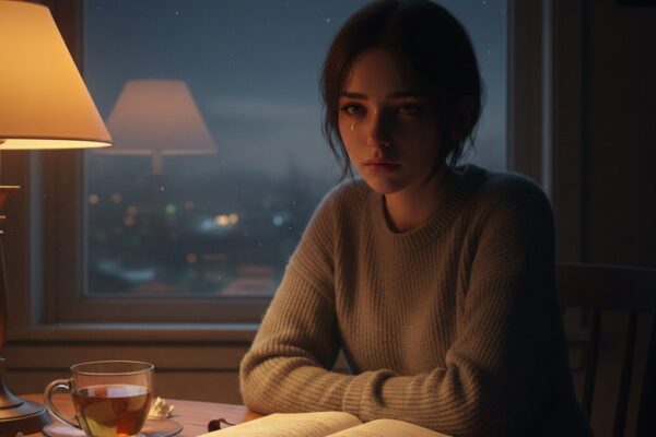 रात के समय खिड़की के पास बैठा एक लेखक, कोरे काग़ज़ पर कलम से भावनाएँ लिखता हुआ